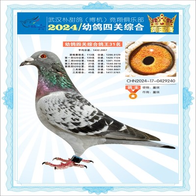 2024年武汉朴甜鸽[博杭]幼鸽四关综合鸽王31名