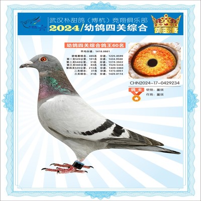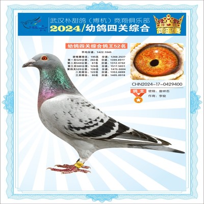 2024年武汉朴甜鸽[博杭]幼鸽四关综合鸽王52名