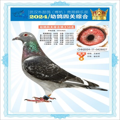 2024年武汉朴甜鸽[博杭]幼鸽四关综合鸽王58名