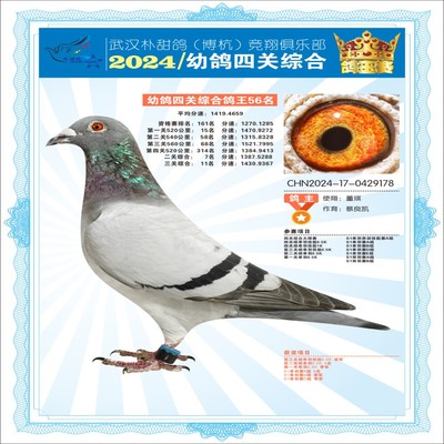 2024年武汉朴甜鸽[博杭]幼鸽四关综合鸽王56名