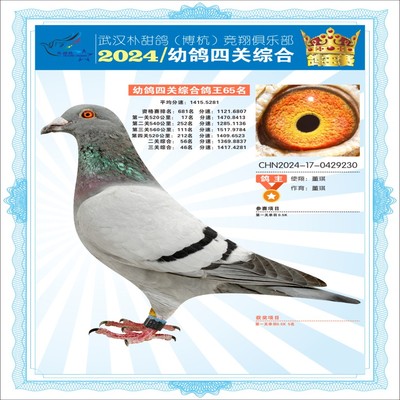 2024年武汉朴甜鸽[博杭]幼鸽四关综合鸽王68名