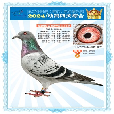 2024年武汉朴甜鸽[博杭]幼鸽四关综合鸽王53名