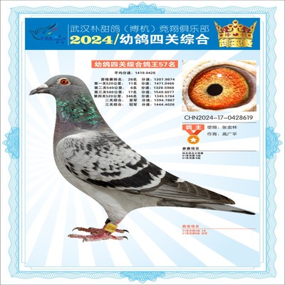 2024年武汉朴甜鸽[博杭]幼鸽四关综合鸽王57名