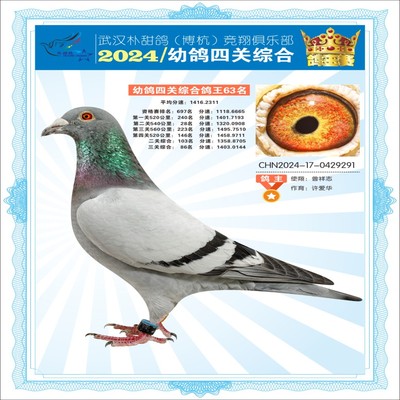 2024年武汉朴甜鸽[博杭]幼鸽四关综合鸽王63名