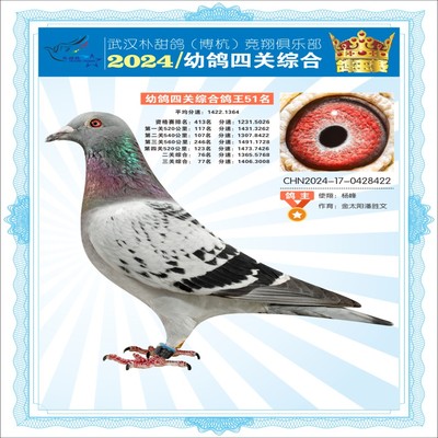 2024年武汉朴甜鸽[博杭]幼鸽四关综合鸽王51名