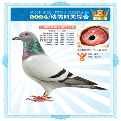 2024年武汉朴甜鸽[博杭]幼鸽四关综合鸽王98名