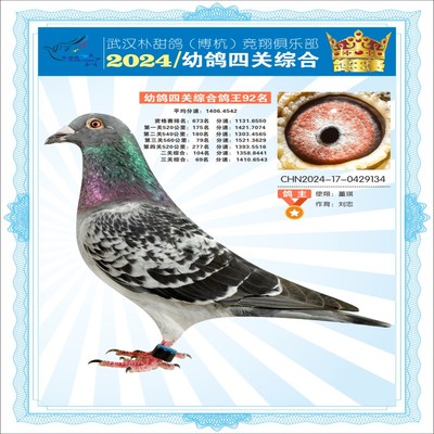2024年武汉朴甜鸽[博杭]幼鸽四关综合鸽王92名