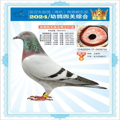 2024年武汉朴甜鸽[博杭]幼鸽四关综合鸽王97名