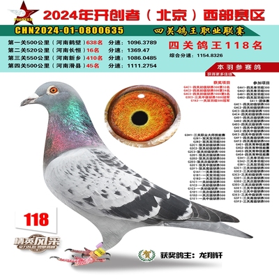 2024年开创者西部四关鸽王118名
