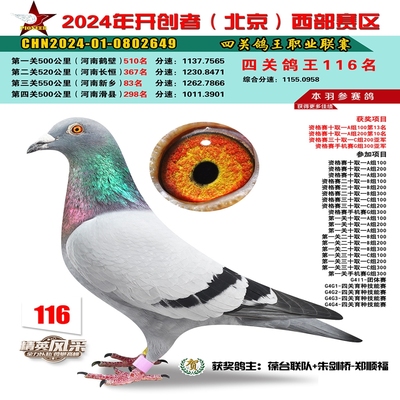 2024年开创者西部四关鸽王116名
