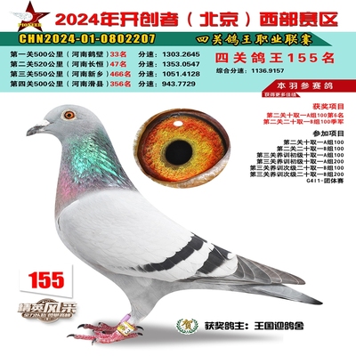 2024年开创者西部四关鸽王155名