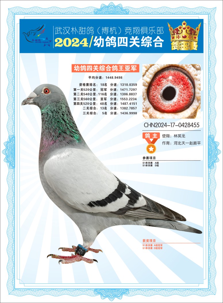2024年武汉朴甜鸽[博杭]幼鸽四关综合鸽王亚军