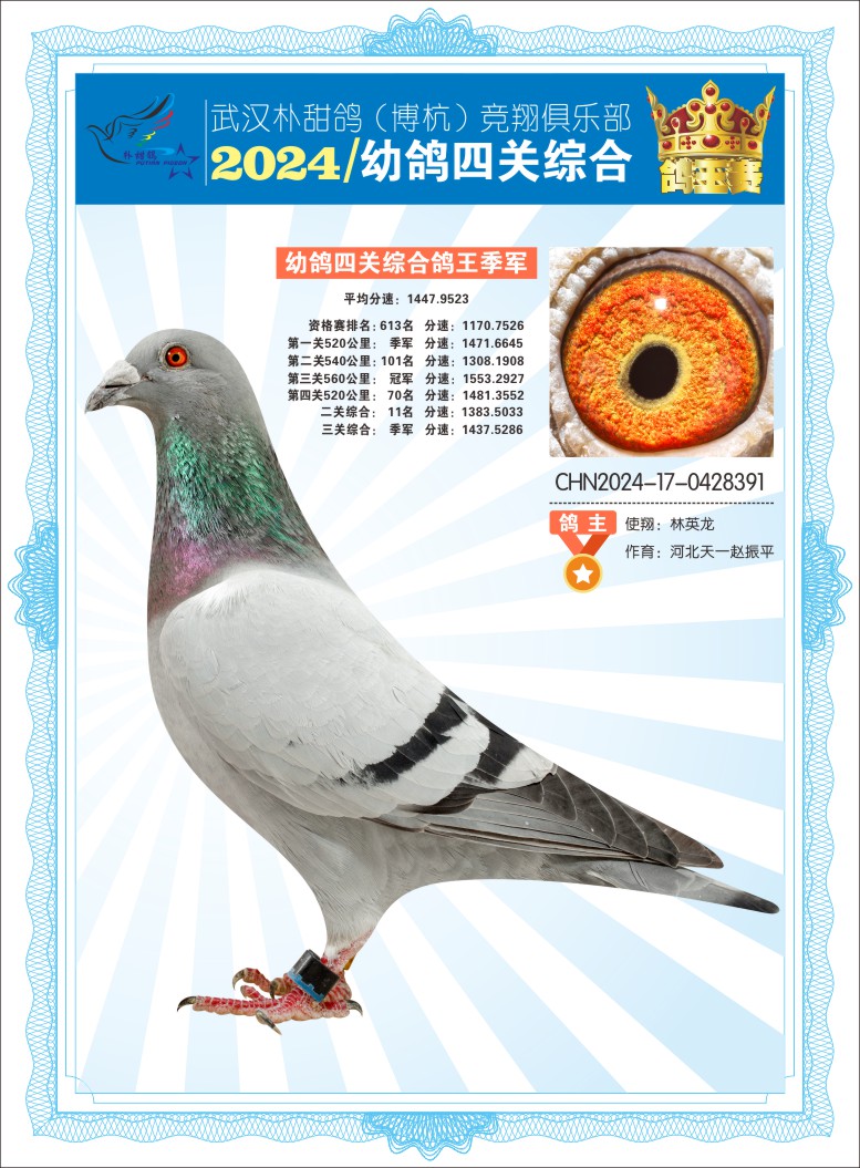 2024年武汉朴甜鸽[博杭]幼鸽四关综合鸽王季军