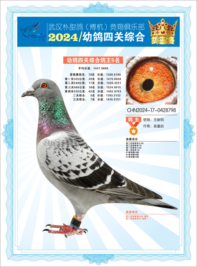 2024年武汉朴甜鸽[博杭]幼鸽四关综合鸽王5名