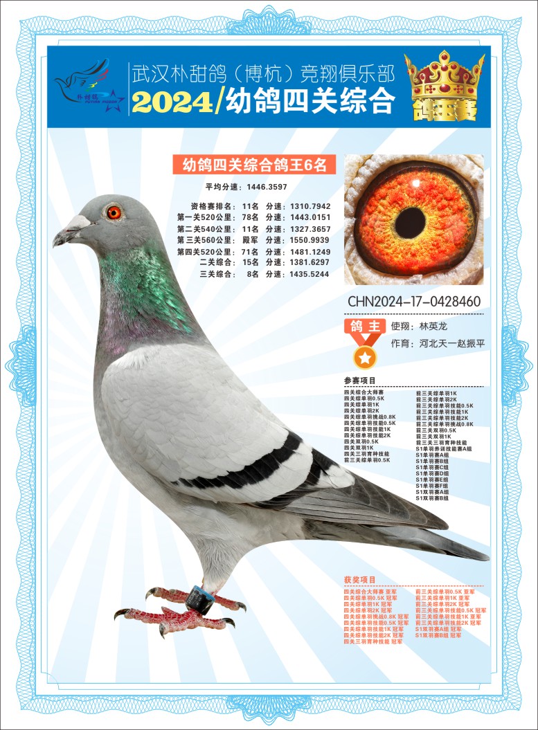 2024年武汉朴甜鸽[博杭]幼鸽四关综合鸽王6名