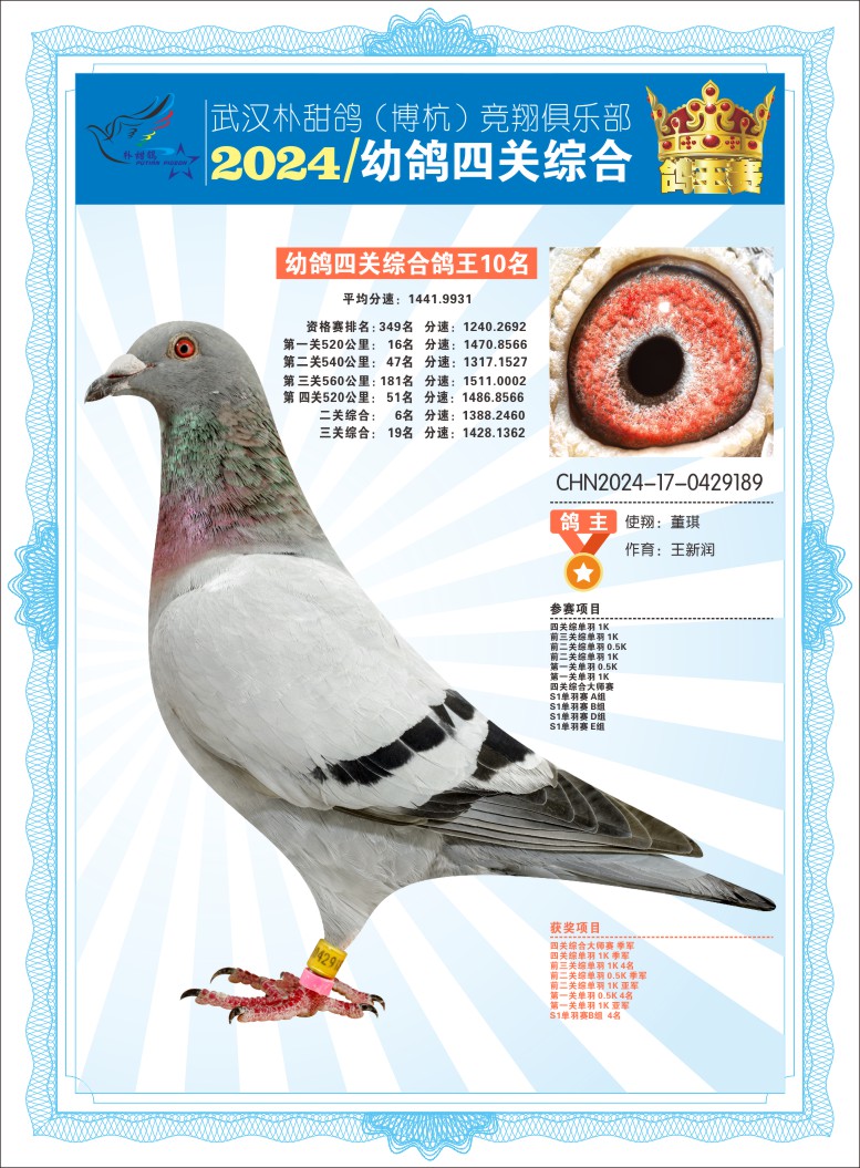 2024年武汉朴甜鸽[博杭]幼鸽四关综合鸽王10名