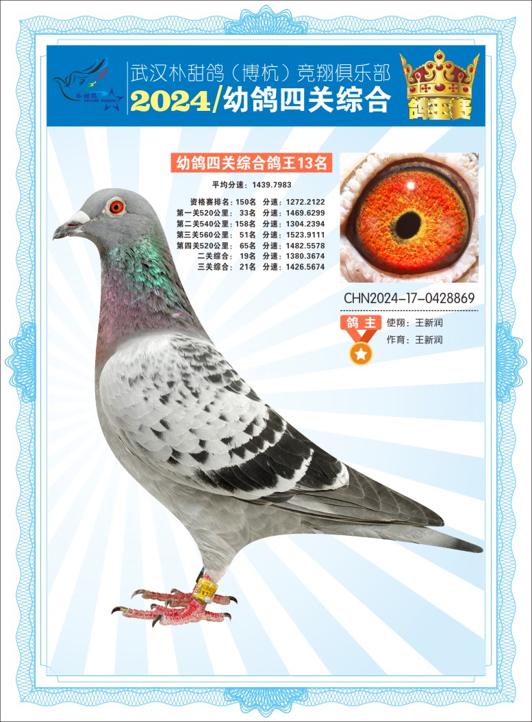 2024年武汉朴甜鸽[博杭]幼鸽四关综合鸽王13名