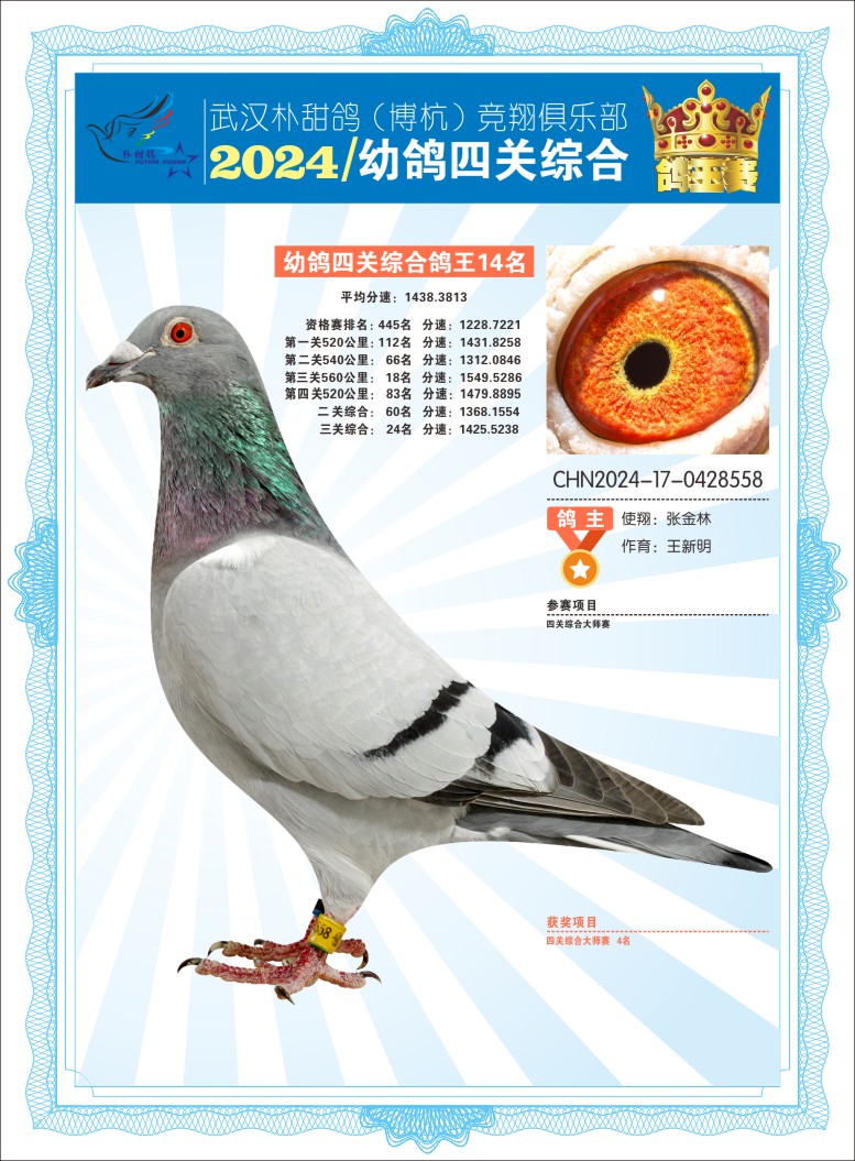2024年武汉朴甜鸽[博杭]幼鸽四关综合鸽王14名