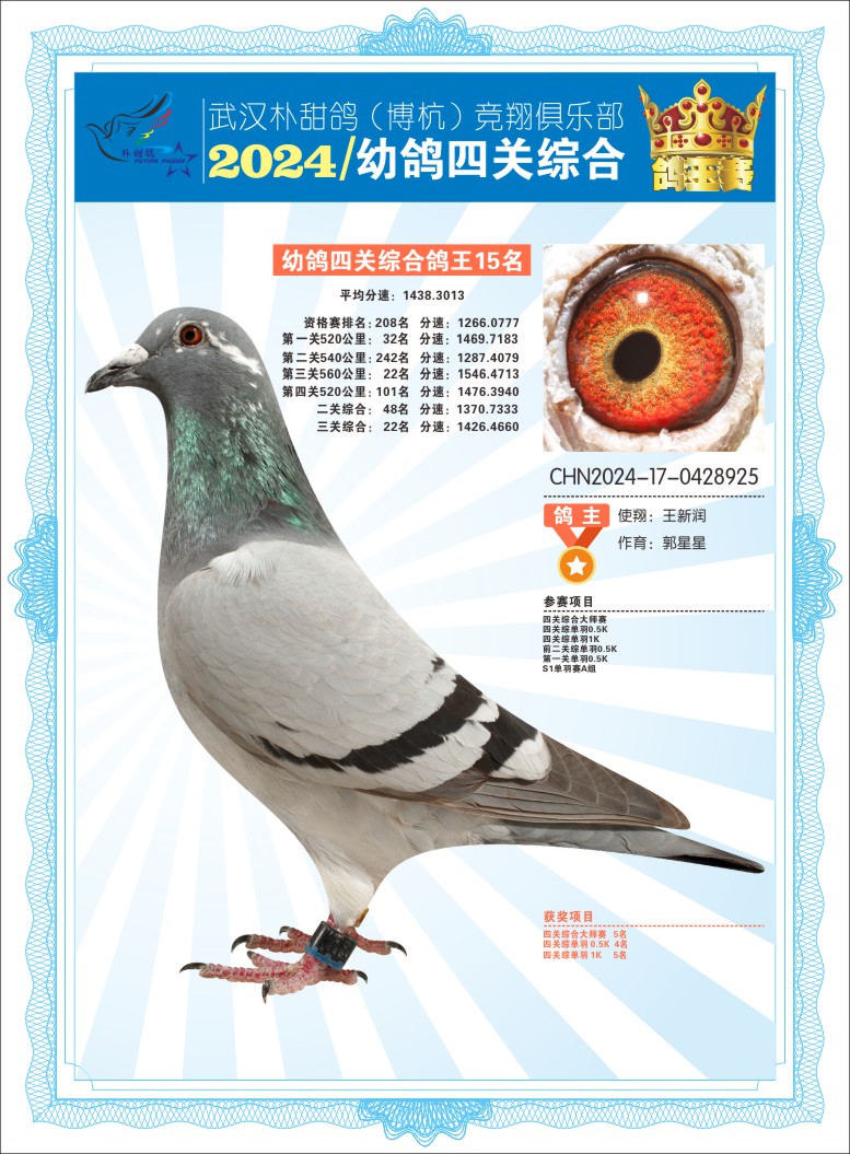 2024年武汉朴甜鸽[博杭]幼鸽四关综合鸽王15名