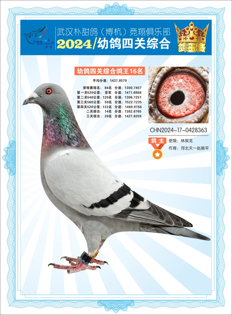 2024年武汉朴甜鸽[博杭]幼鸽四关综合鸽王16名