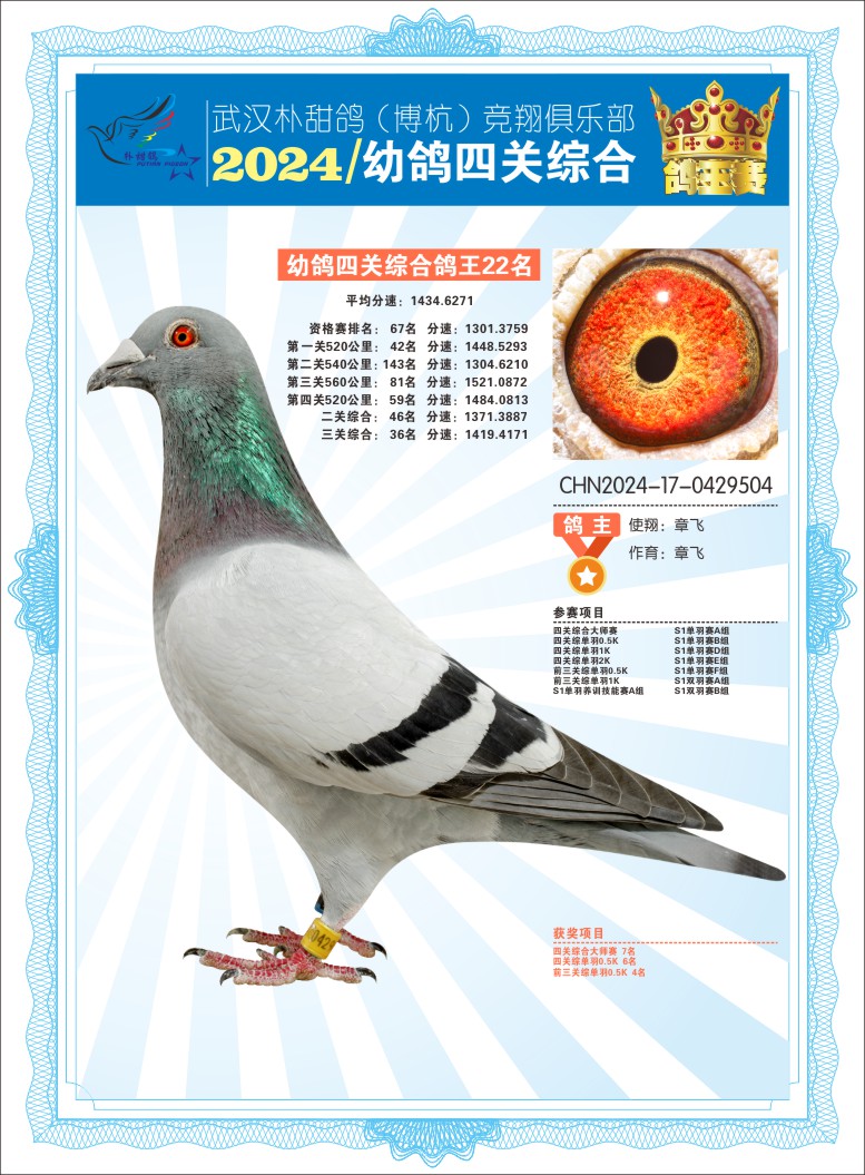 2024年武汉朴甜鸽[博杭]幼鸽四关综合鸽王22名