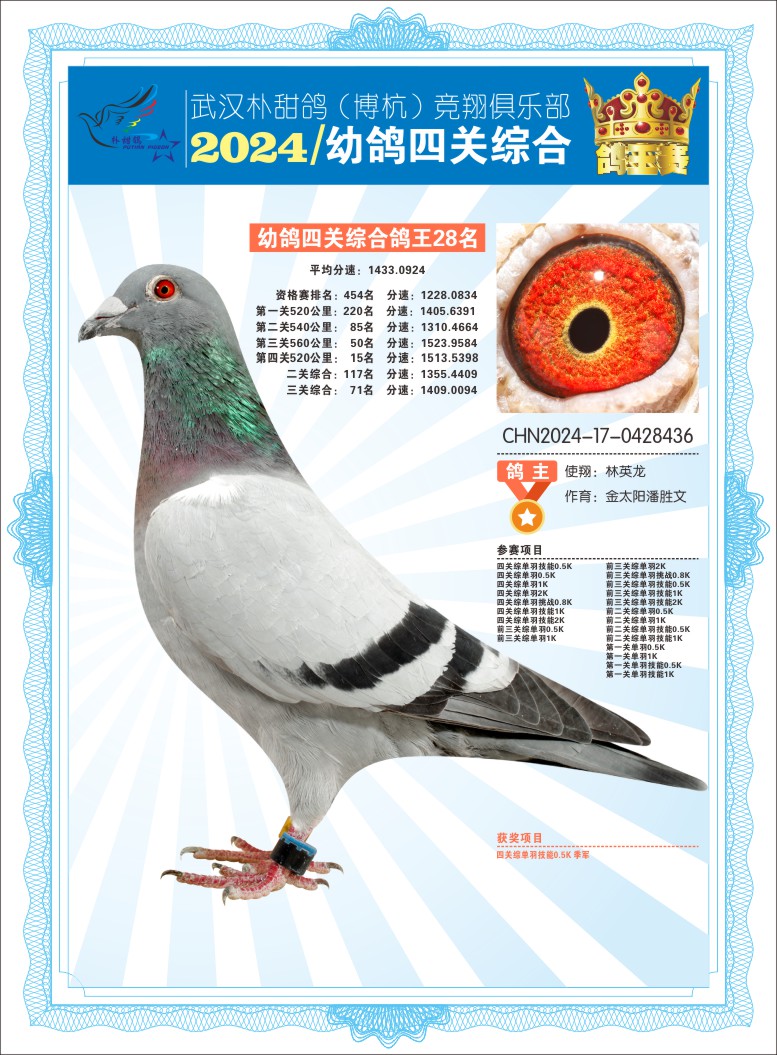 2024年武汉朴甜鸽[博杭]幼鸽四关综合鸽王28名