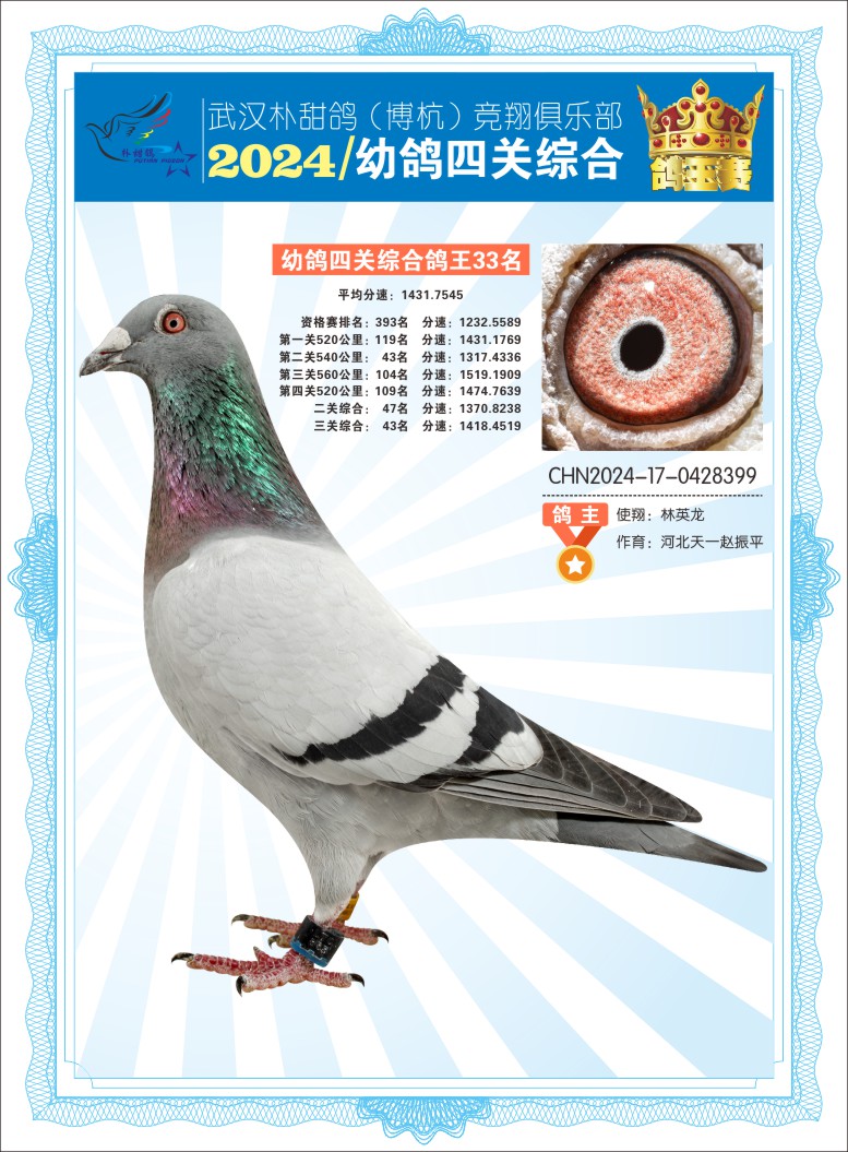 2024年武汉朴甜鸽[博杭]幼鸽四关综合鸽王33名