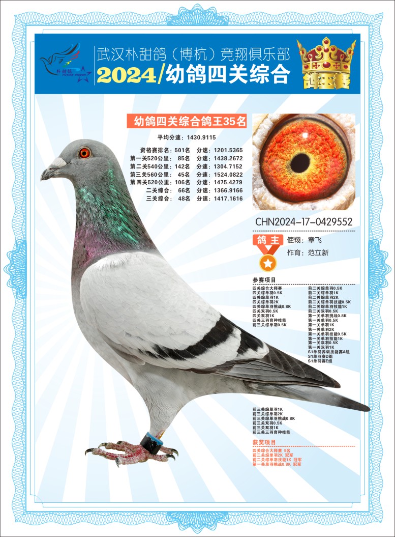 2024年武汉朴甜鸽[博杭]幼鸽四关综合鸽王35名