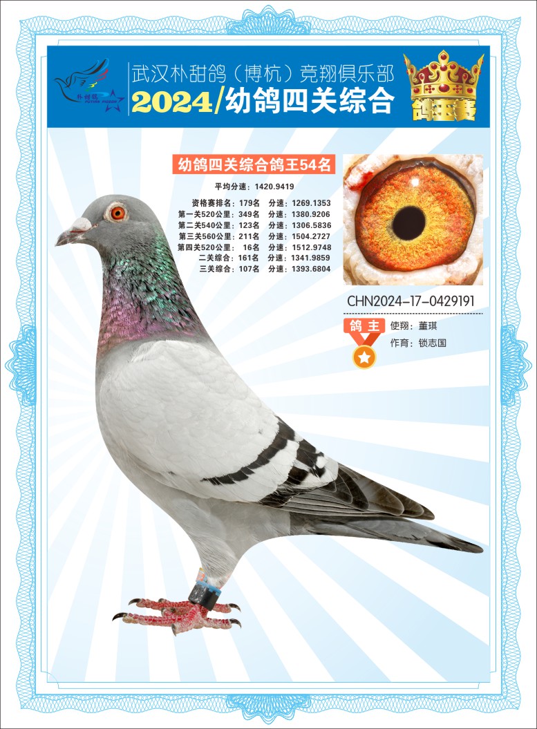 2024年武汉朴甜鸽[博杭]幼鸽四关综合鸽王54名