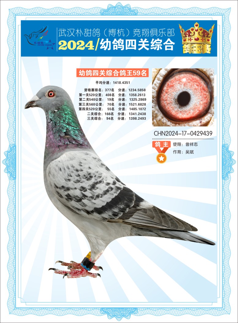 2024年武汉朴甜鸽[博杭]幼鸽四关综合鸽王59名