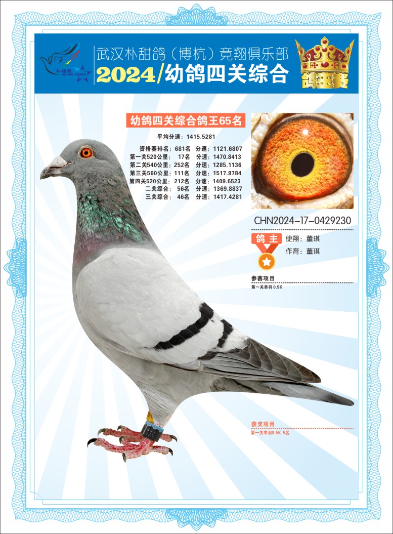 2024年武汉朴甜鸽[博杭]幼鸽四关综合鸽王65名