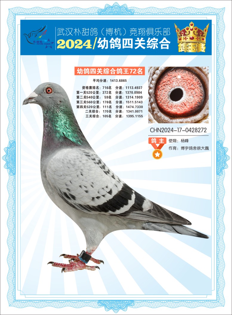 2024年武汉朴甜鸽[博杭]幼鸽四关综合鸽王72名