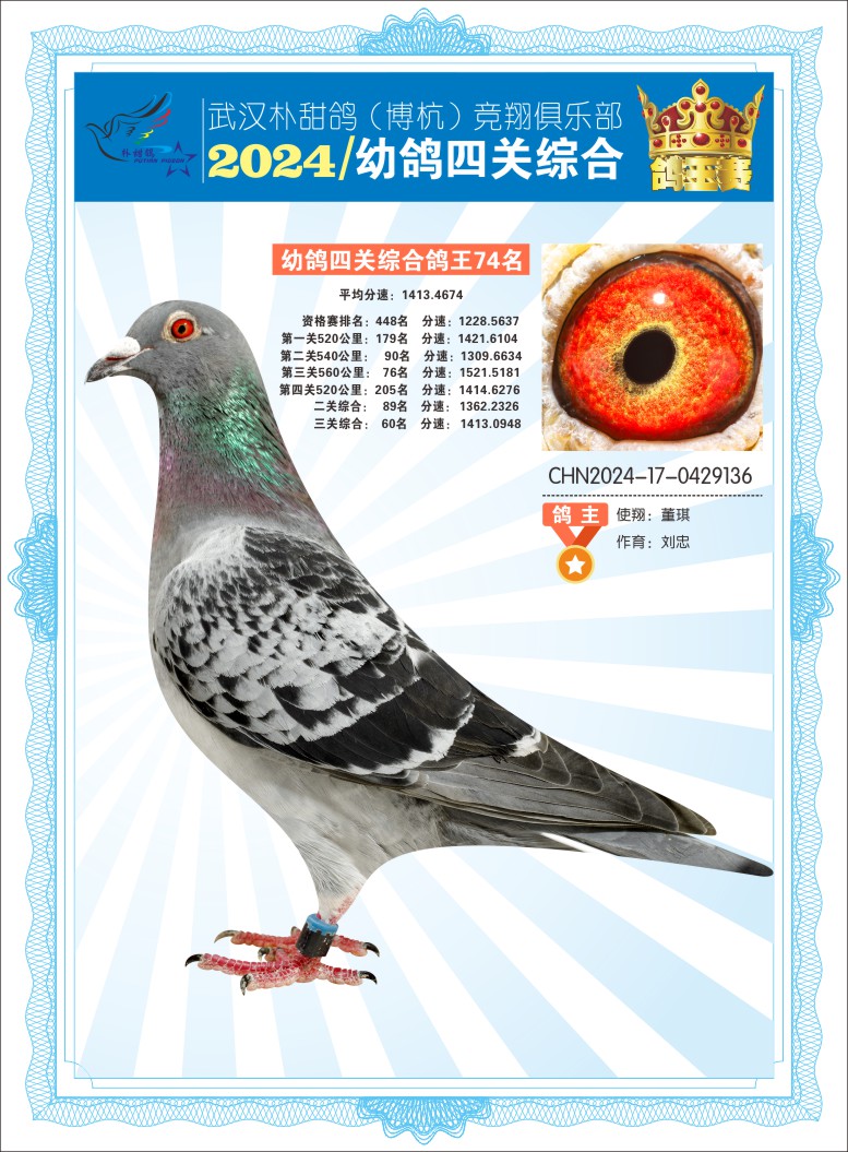2024年武汉朴甜鸽[博杭]幼鸽四关综合鸽王74名