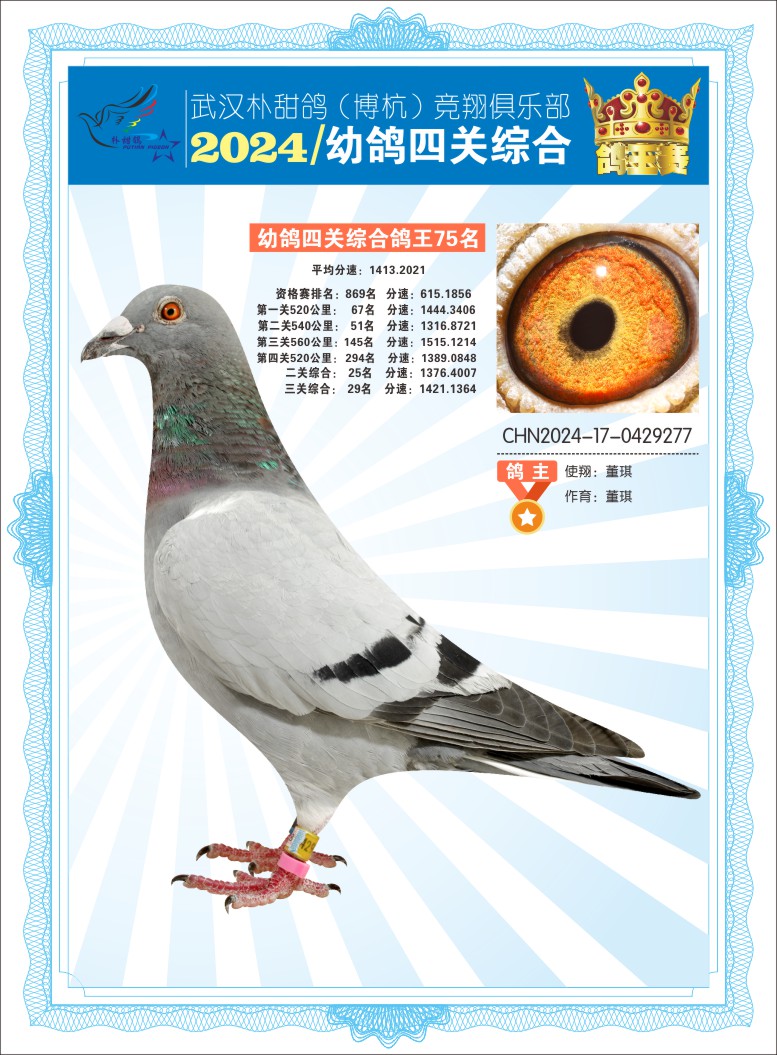 2024年武汉朴甜鸽[博杭]幼鸽四关综合鸽王75名