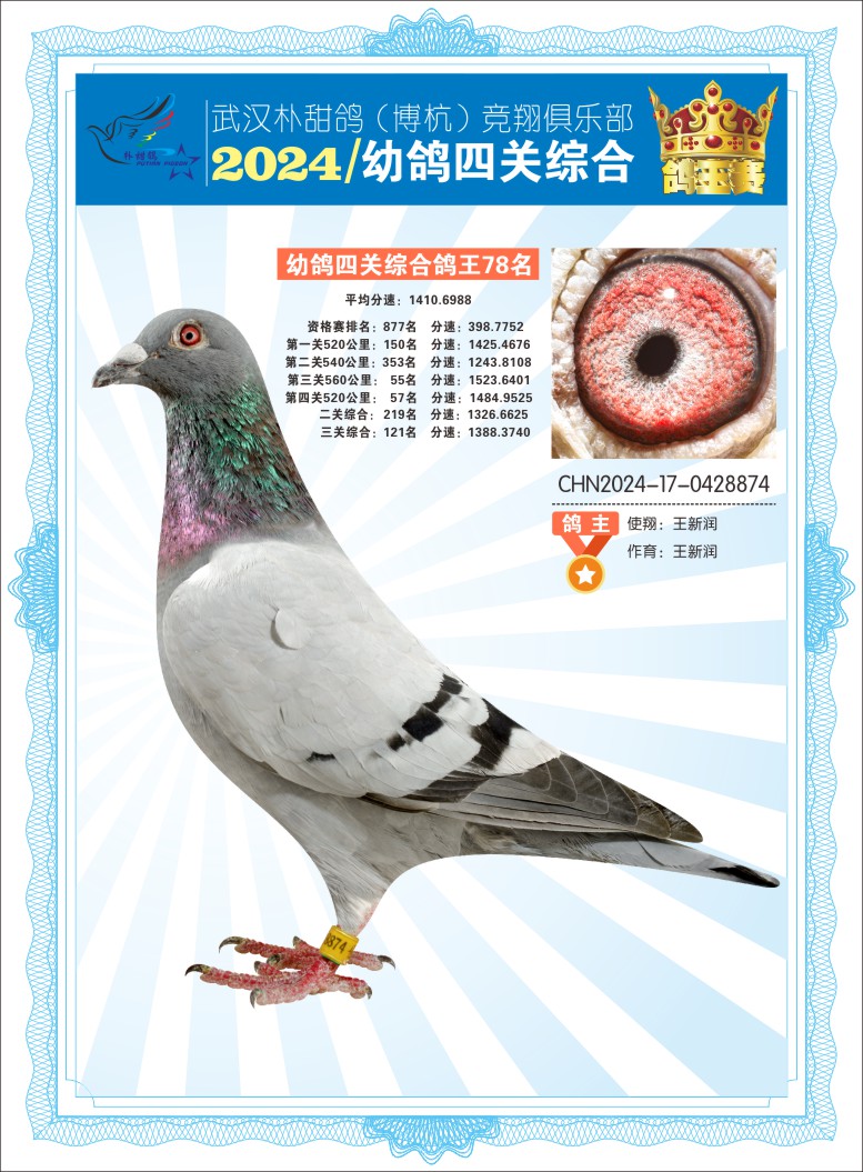 2024年武汉朴甜鸽[博杭]幼鸽四关综合鸽王78名
