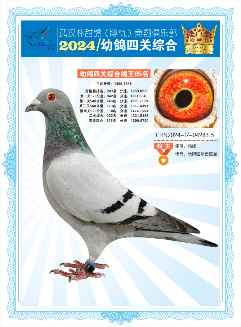 2024年武汉朴甜鸽[博杭]幼鸽四关综合鸽王85名