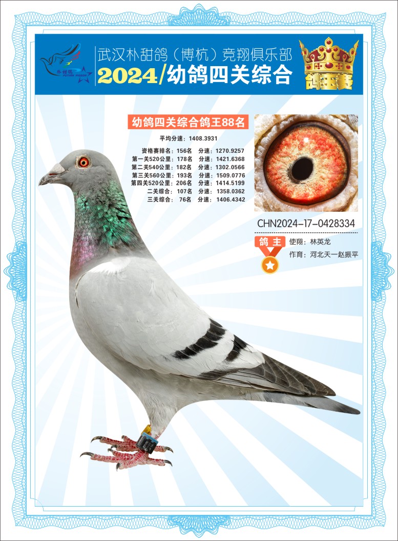 2024年武汉朴甜鸽[博杭]幼鸽四关综合鸽王88名
