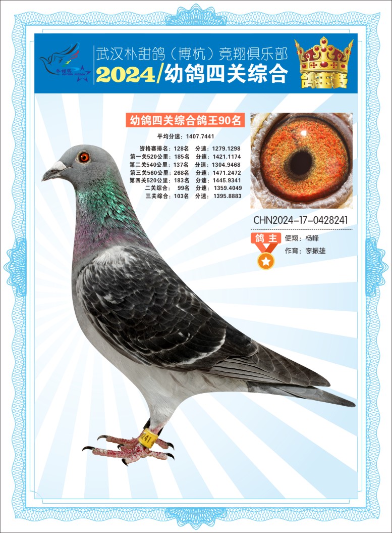 2024年武汉朴甜鸽[博杭]幼鸽四关综合鸽王90名