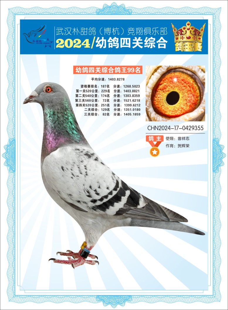 2024年武汉朴甜鸽[博杭]幼鸽四关综合鸽王99名