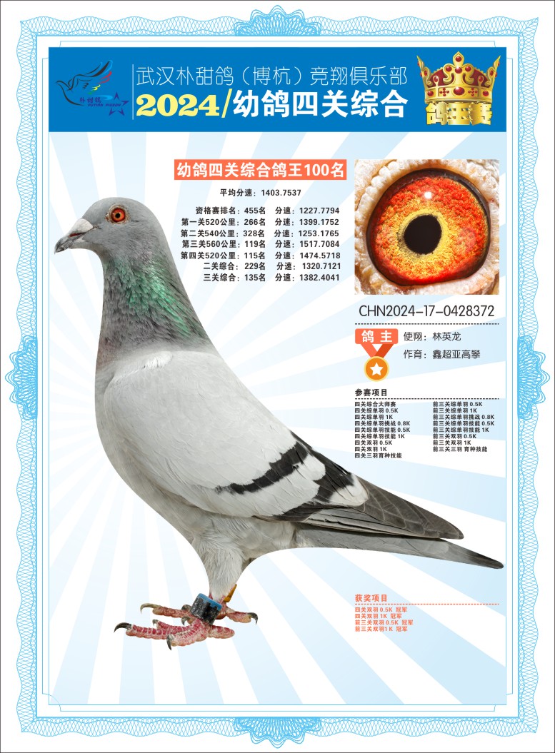 2024年武汉朴甜鸽[博杭]幼鸽四关综合鸽王100名