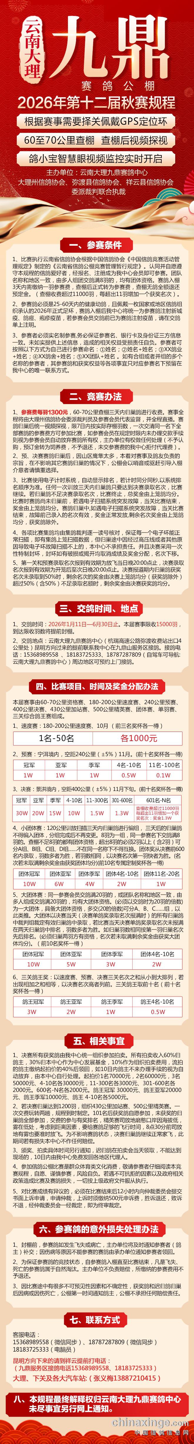 云南大理九鼎赛鸽中心2026年第(十二届)秋赛规程
