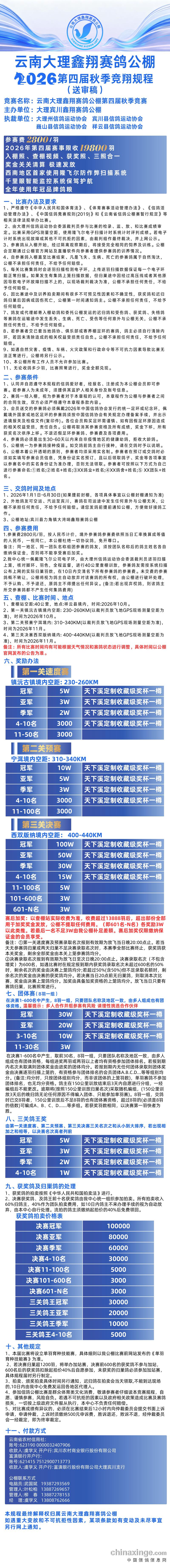 2026年云南大理鑫翔赛鸽公棚第四届秋季竞赛章程