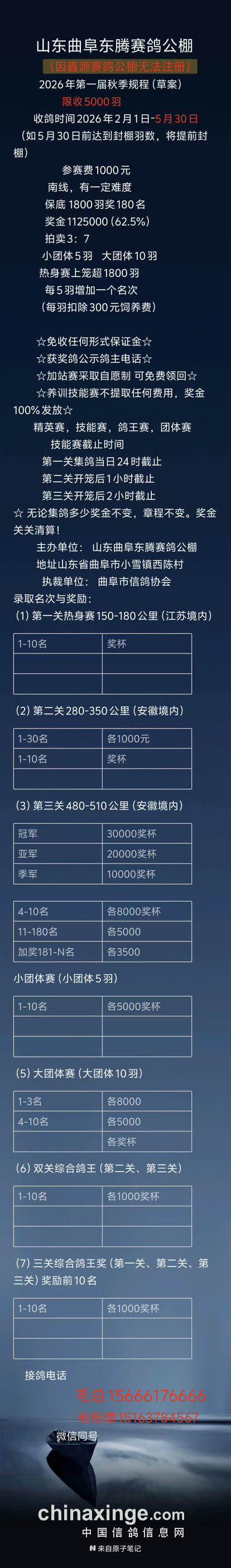 26年山东曲阜东腾赛鸽公棚第一届秋季规程