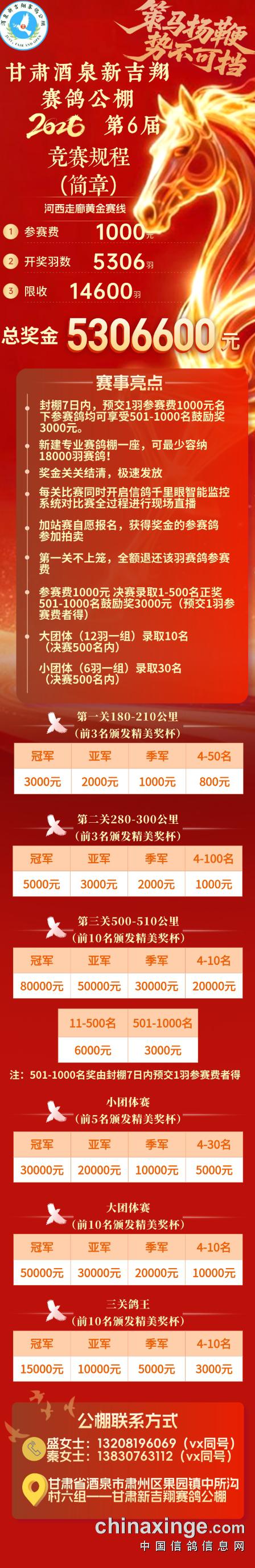 甘肃酒泉新吉翔赛鸽公棚2026年第六届秋季三关赛规程简章