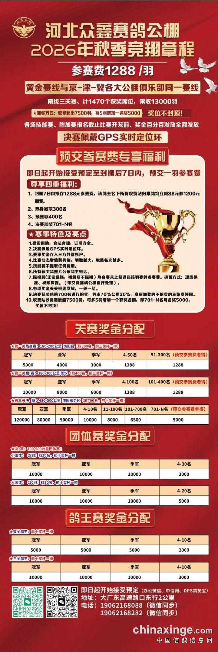 河北众鑫赛鸽公棚2026首届秋赛竞翔章程(简章)