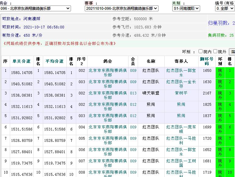 以下是前10名获奖鸽友成绩截图: