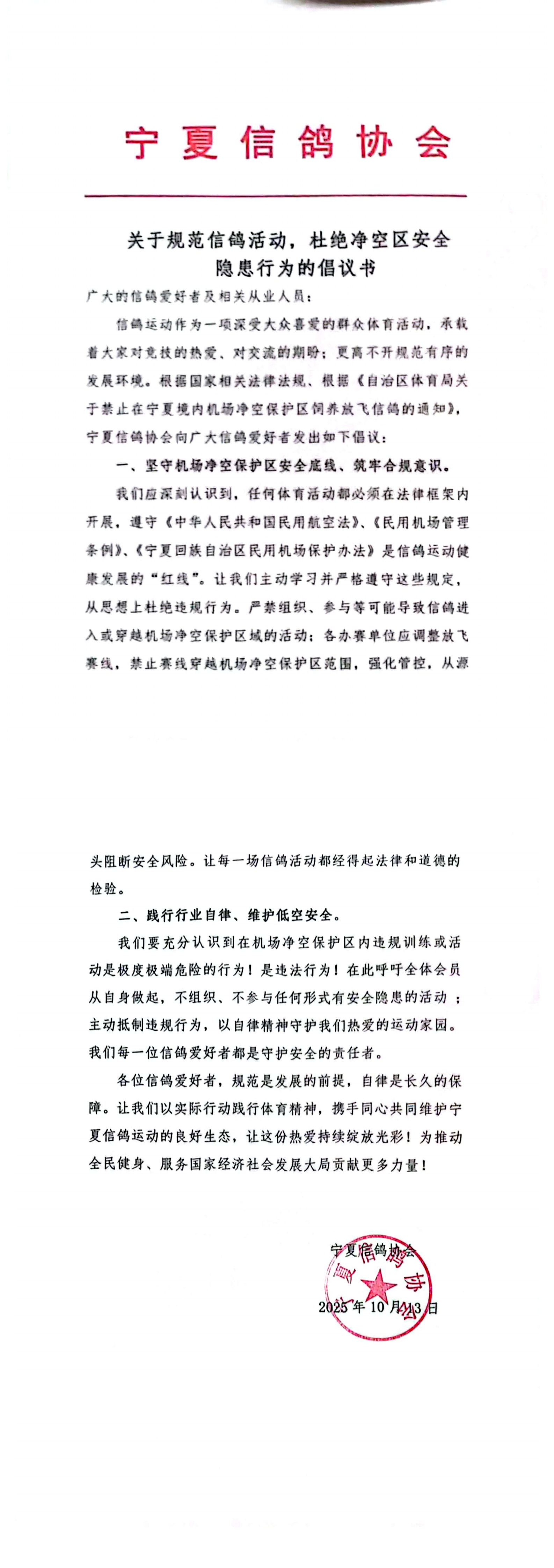 - 关于规范信鸽活动,杜绝净空区安全隐患行为的倡议书