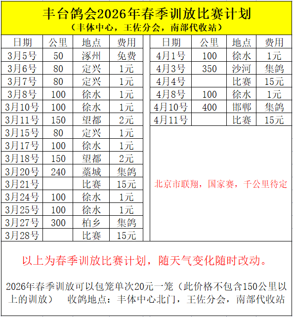 丰台鸽会2026年春季训放比赛计划