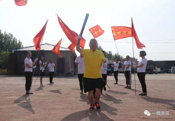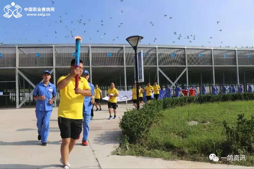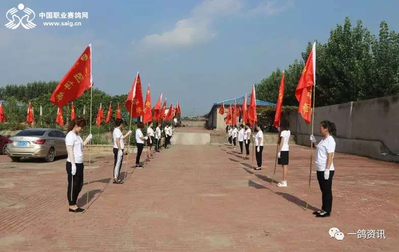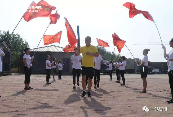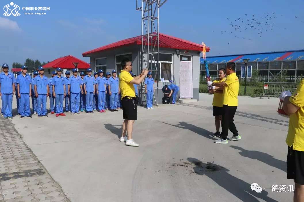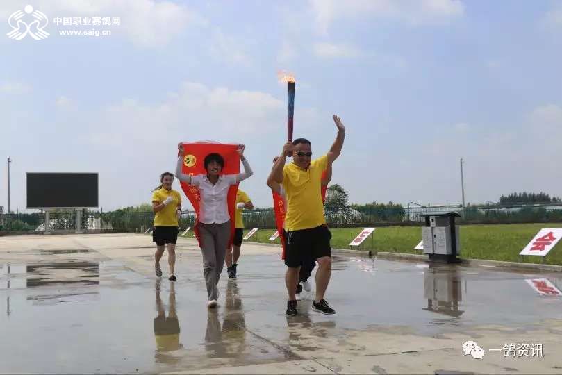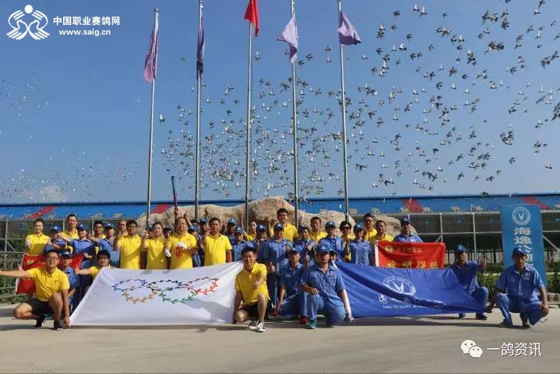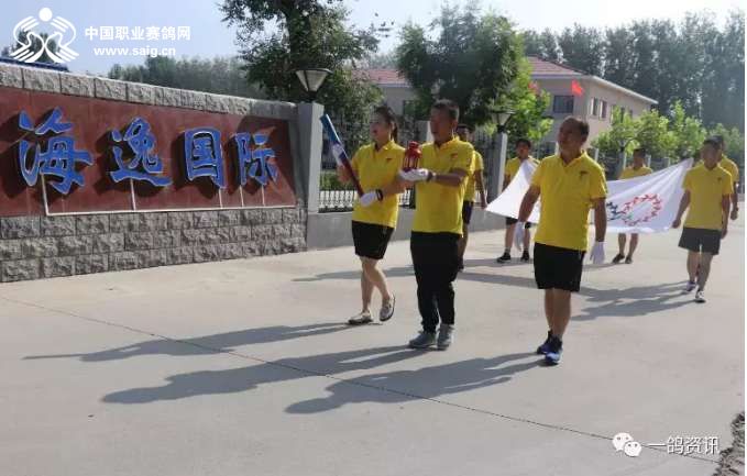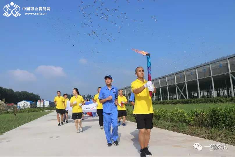 上午9时许,还未抵达海逸公棚,就望见公棚副总经理贾洪波、行政总监和小倩、行政经理丁杰红带领全体员工,或着蓝色制服,或着火炬传递制服,整齐列队在大门外恭候圣火的到来。迎着朝阳,在雄壮的乐曲中,一阵阵鸽群盘旋而过,犹如等待评审团检阅的空中战队。圣火传递的场面激昂人心,蔚为壮观!对此次活动,海逸公棚表示极大的肯定与支持,也希望活动能得到鸽界更多有识之士的认可与支持,海逸公棚全体成员愿和他们为中国信鸽运动加油喝彩!