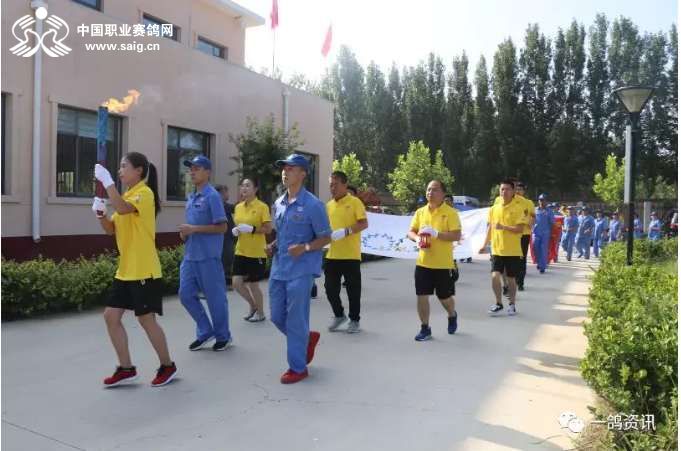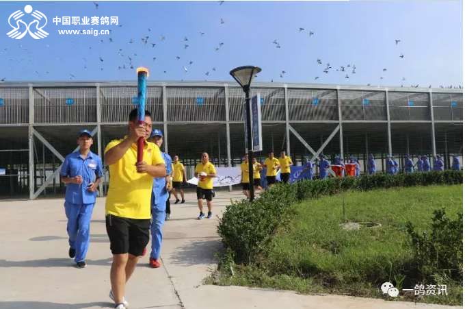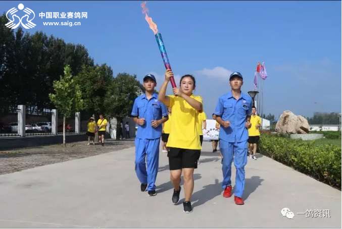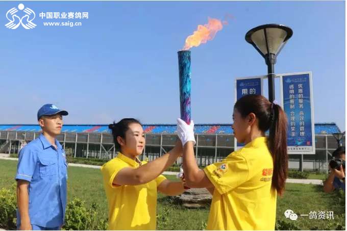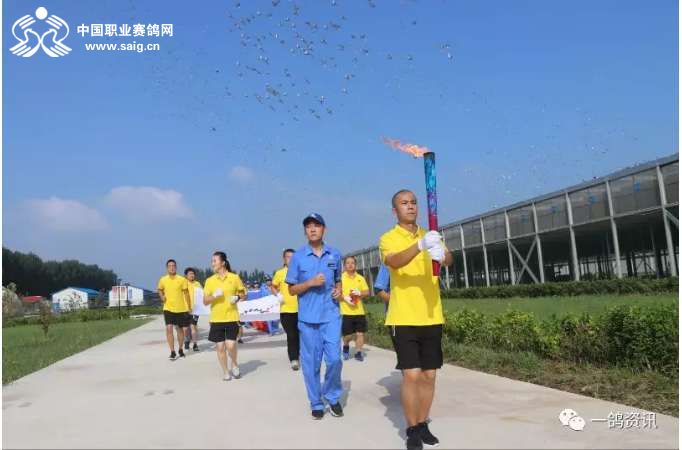 火炬接力手分别为(公棚行政总监和小倩 公棚教练师文辉 公棚种鸽教练窦晓伟 公棚教练助理徐涛 鸽友柴熙 鸽友王佳旭)